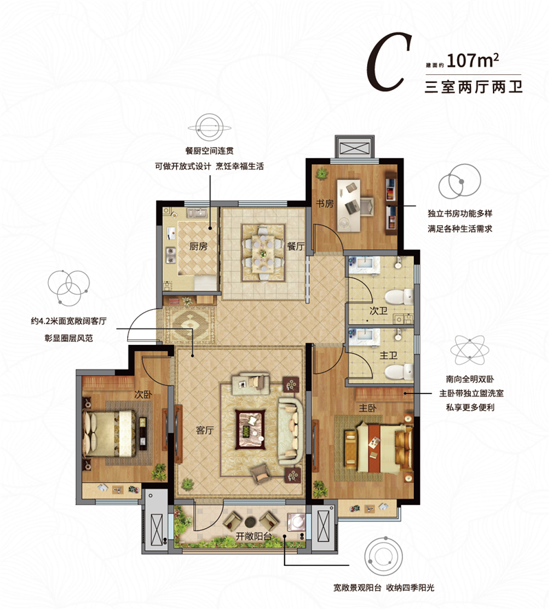 全明方正户型,南北通透,瞰景宽绰阳台,与家人一同共享四季景致的更替和全龄社区的活力。超尺度阳台,除了晾晒、瞰景等常规功能外,多功能空间布局,匹配家庭每位成员的生活渴望。舒适主卧配备瞰景飘窗,缔造生活仪式感;部分实景现房交付,即买即入住,幸福不必等待。