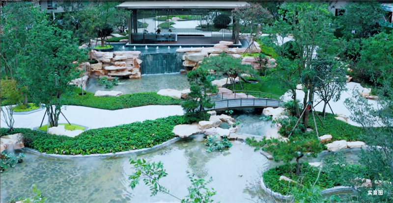 鑫江·瑞府,充分考虑山景、宅邸、人居理念,整体以纵向为轴、横向为脉的布局方式,匠筑“三苑六巷七园”三重围合园境,取法王维《辋川图》精髓打造瑞府二十景,华子冈、歆湖、揽胜轩、卧虹桥......每一处景观皆有特色,与叠瀑、远山相衬,与建筑自然相融,别有一番趣味。同时将乌桕、紫薇、泰山松等多种名贵苗木全冠移植其中,并搭配四季主题植物,使得绿地率高达约40%,开窗即是满目葱绿。